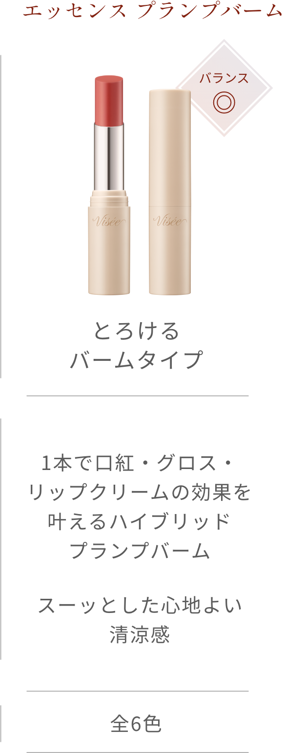 透明度が高く密着感のある成分を厳選し組み合わせることで、時間がたっても濁りのない透き通るような発色を叶え、ぷるんとしたつや膜が密着し、ボリューミィな唇を演出します。 - 体温付近で溶けるオイルを配合し、グロスのようにやわらかくとろけるようなのび広がりを実現。バーム特有のべたつき感がなく、ムラなく均一に唇に密着します。