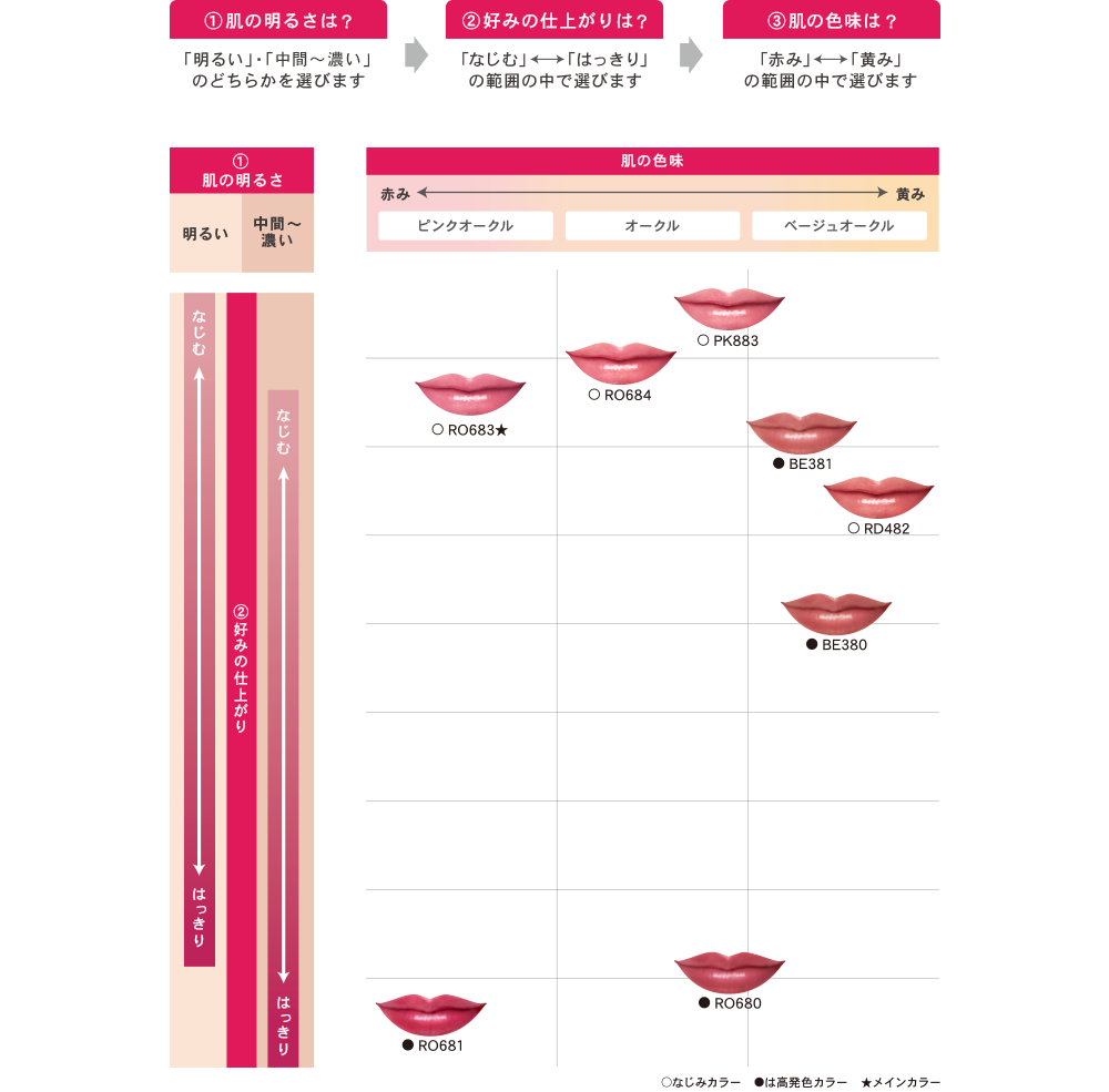 ◆ 顔色まで美しく魅せるルージュに、“なじみ発色タイプ”登場。肌になじむ発色で、カジュアルなスタイルにもぴったりな顔色華やぐ口もとへ。