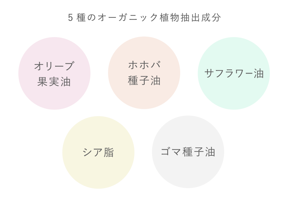 5種のオーガニック植物抽出成分はオリーブ果実油・ホホバ種子油・サフラワー油・シア脂・ゴマ種子油。