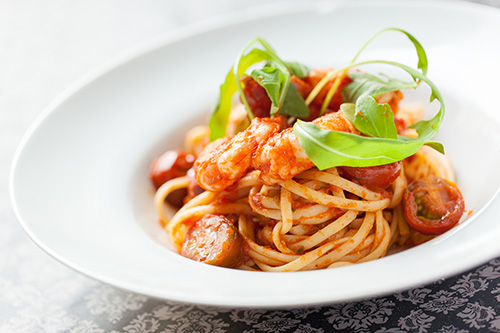 料理は高く積み上げるように盛り付けるのがコツ。パスタや煮物など、大皿に盛り付ける料理はそれだけで見栄えがアップします。高さをコントロールしづらい料理の場合は、食器のセレクトを工夫するのがポイント。