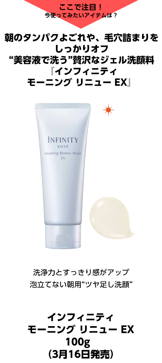 うるおいはそのままに、ぬるつきの残らないすっきりとした洗い流しのよい朝用洗浄料を選んで、朝の肌を爽快に目覚めさせて。忙しい朝だからこそ、快適に使用できるかどうかもポイントに。