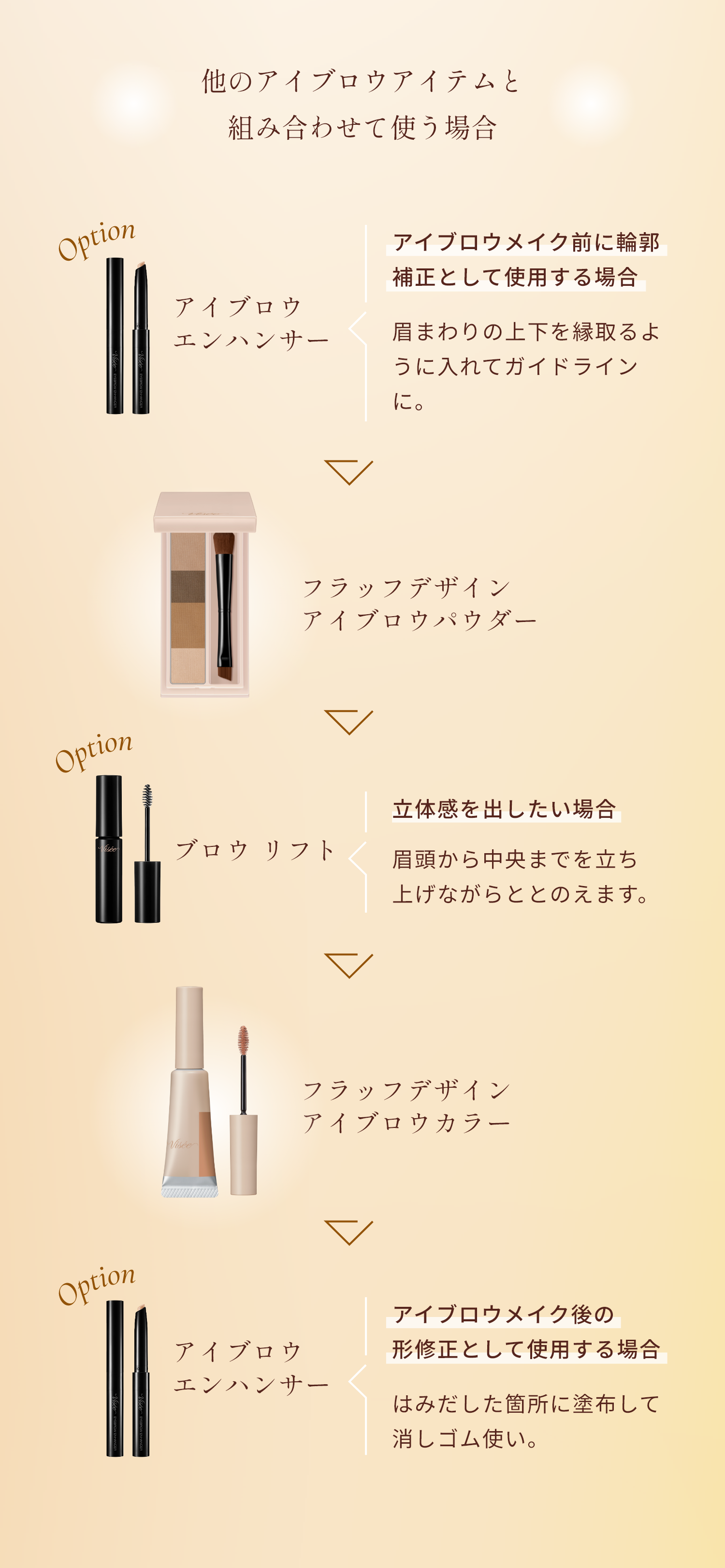 - ペンシルタイプやパウダータイプのアイブロウと併用する場合は、最後に本品をお使いください。