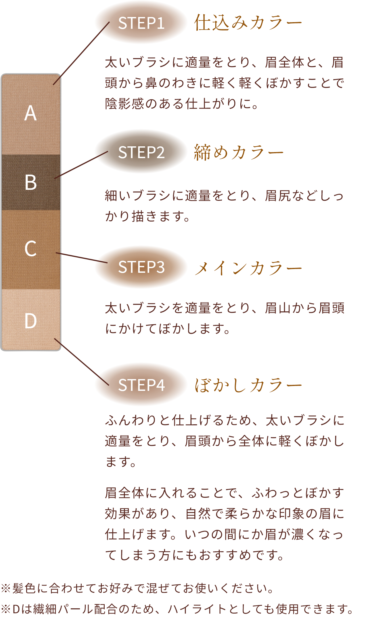 - ※Dは繊細パール配合のため、ハイライトとしても使用できます。