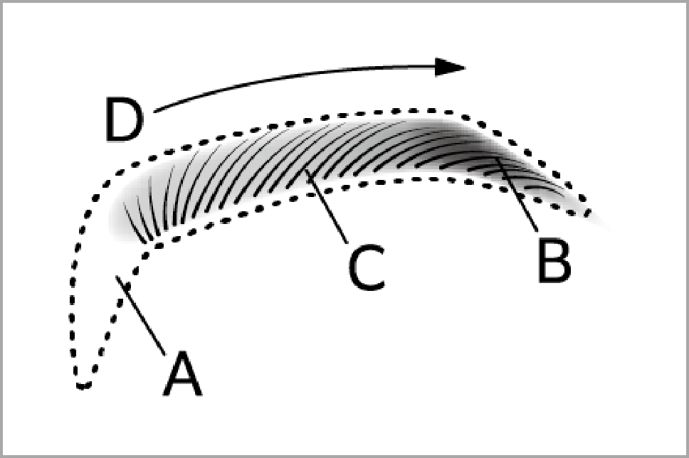 - C:太いブラシに適量をとり、眉山から眉頭にかけてぼかします。