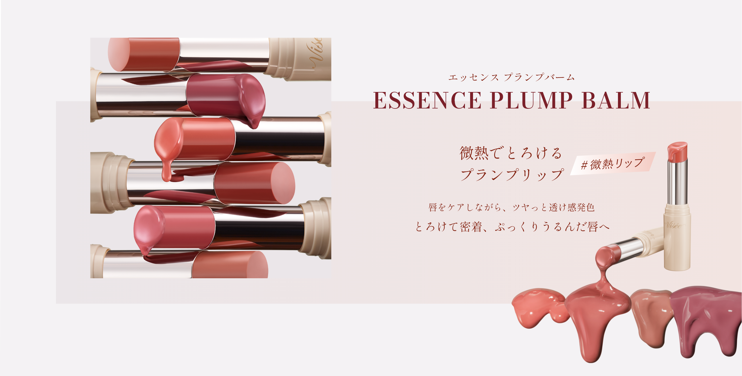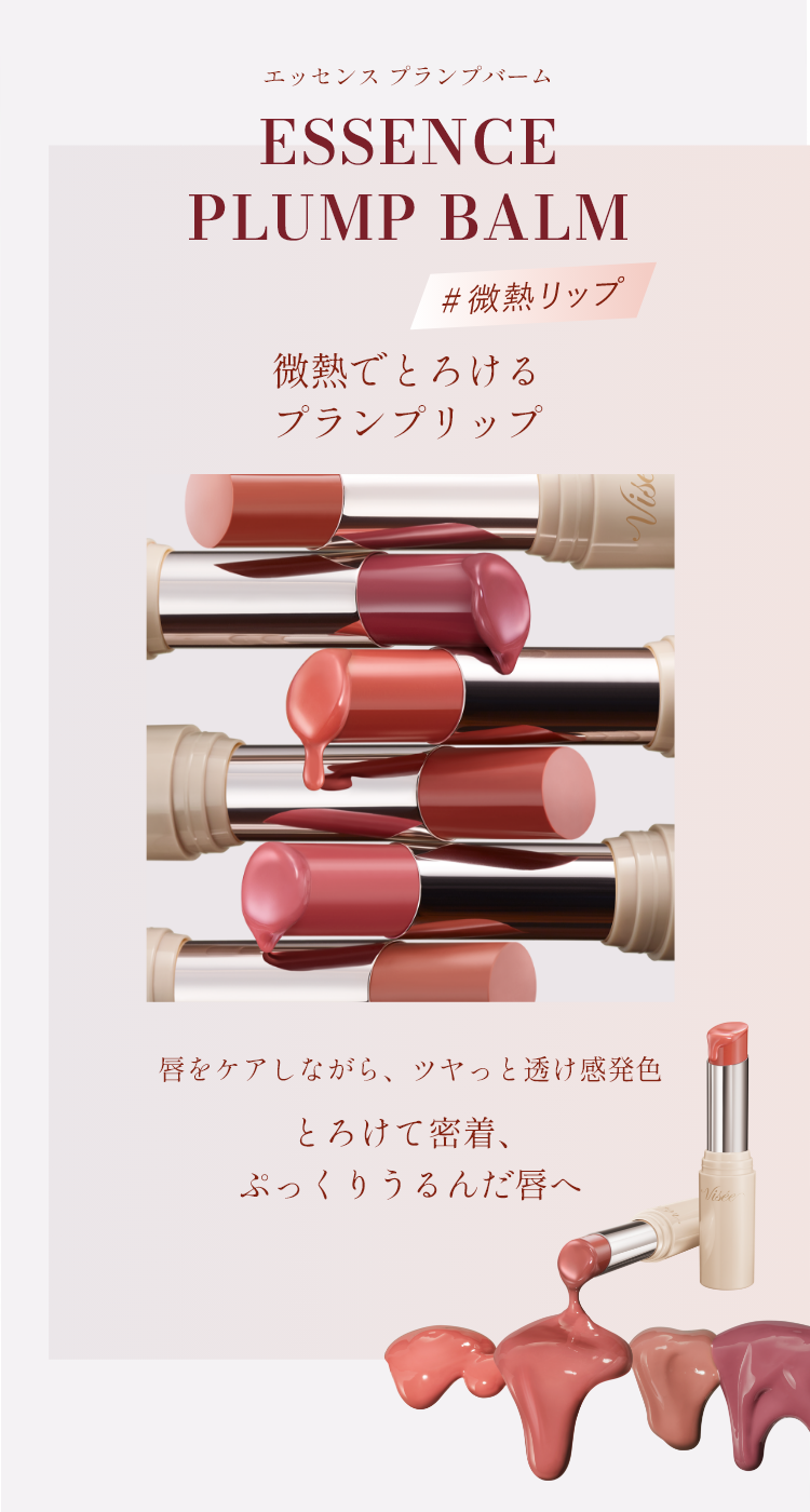 透明度が高く密着感のある成分を厳選し組み合わせることで、時間がたっても濁りのない透き通るような発色を叶え、ぷるんとしたつや膜が密着し、ボリューミィな唇を演出します。 - 体温付近で溶けるオイルを配合し、グロスのようにやわらかくとろけるようなのび広がりを実現。バーム特有のべたつき感がなく、ムラなく均一に唇に密着します。