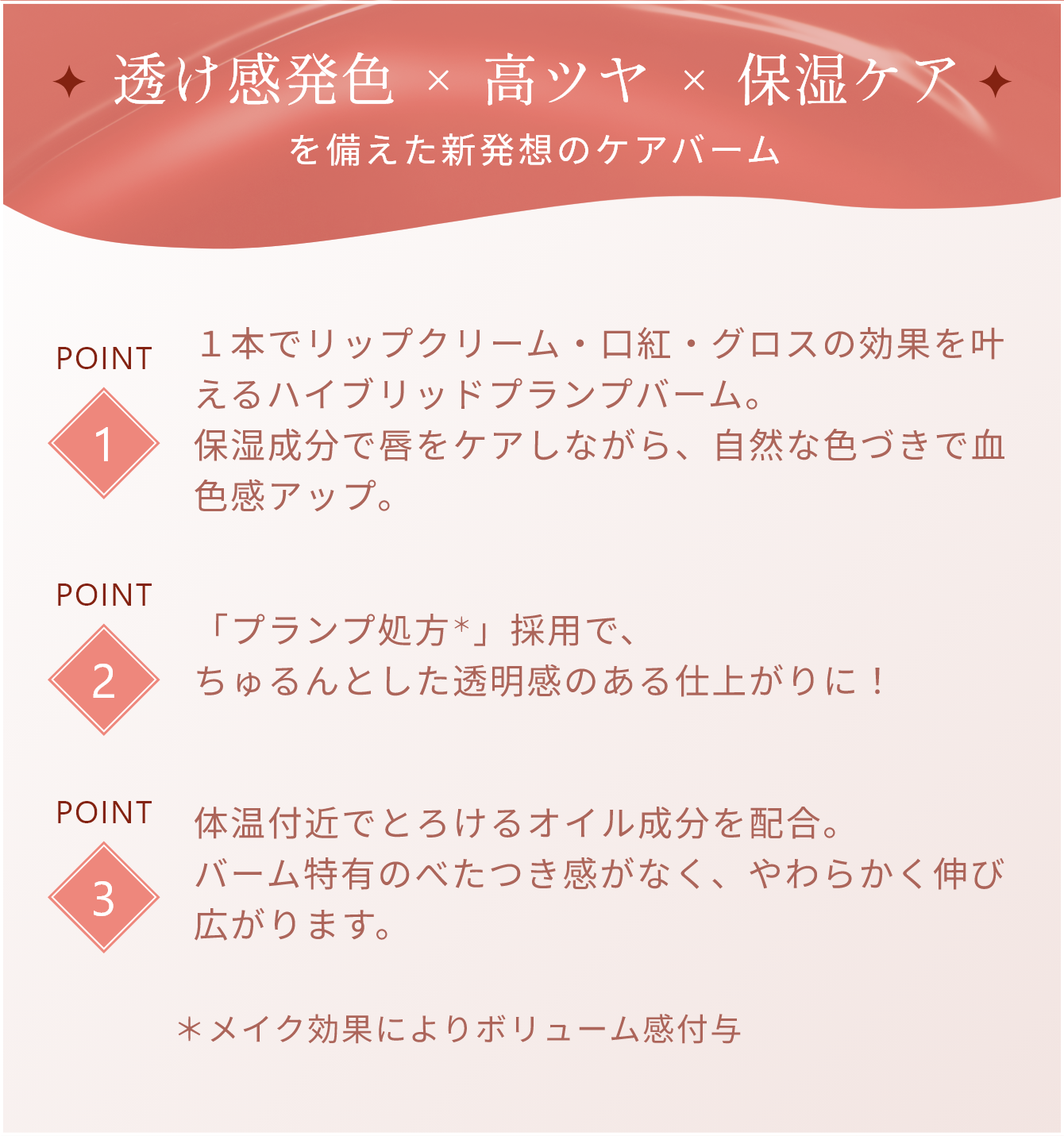 1本でリップクリーム・口紅・グロスの効果を叶えるハイブリッドプランプバームです。 - つや高く、ふっくらぷるんとした唇を叶える「プランプ処方*」採用。
